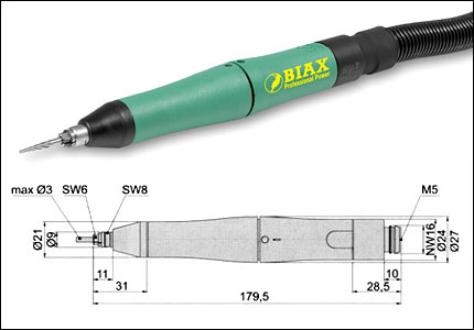 Lamella motor without lubrication, double bearing for extreme applications. Ring nut valve, back air blowdown, elastic front bearings. Supplied with hose.