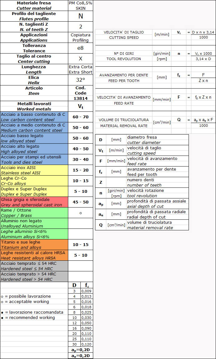 2 flute ball-nosed end mill for profiling, sintered HSS-Co8.5% with Ti and Al based multi-coating Skin for steel, cast, iron, inox, titanium, HRSA, ISO 1641/I. Cutting edge profile N for finishing medium-alloy materials, extra-short length, cylindrical shank; Weldon or threaded shank available upon request.