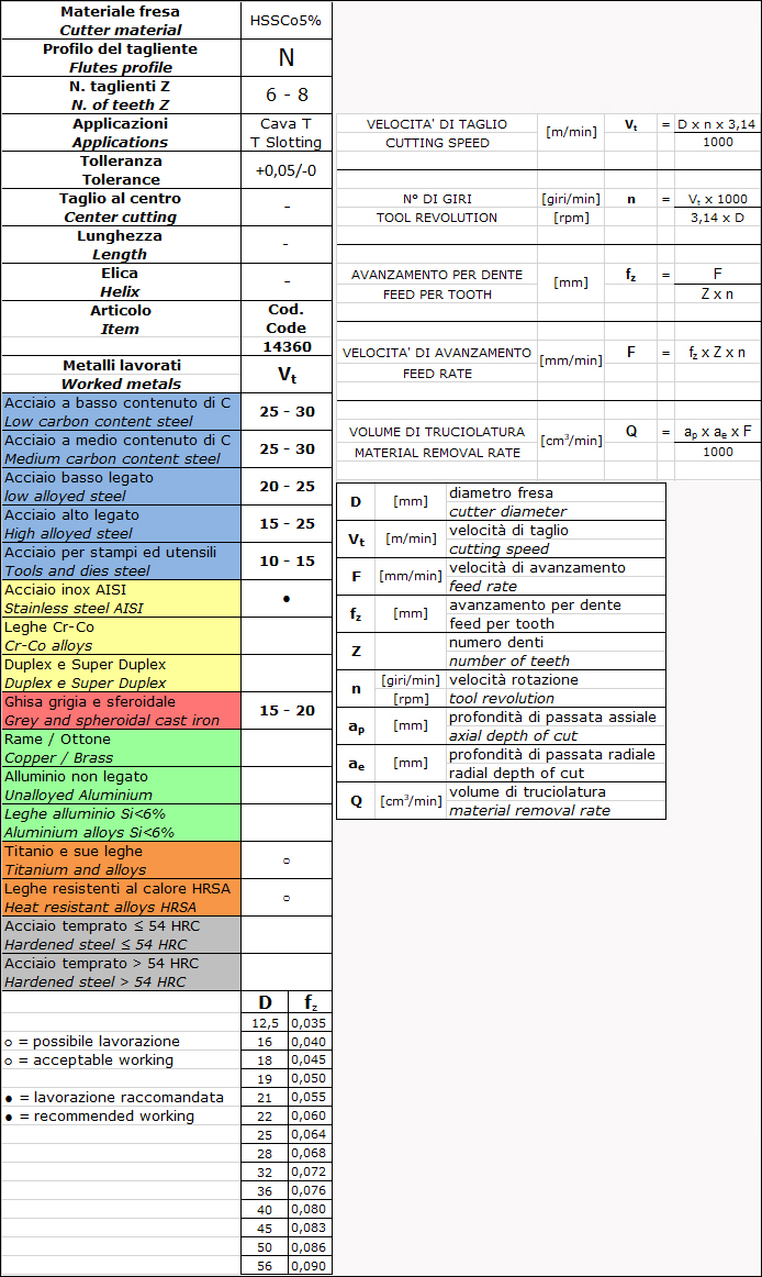 T slot cutter, HSS-Co5% with bright finish, UNI 7339A, DIN 851, ISO 3337. Cutting edge profile N for finishing medium-alloy materials, cylindrical shank; Weldon or threaded shank available upon request.