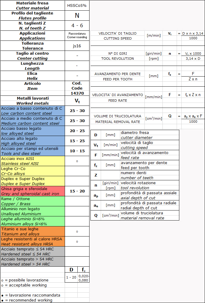 Corner-rounding cutter, HSS-Co5% with bright finish, UNI 8264, DIN ISO 6518A. Cutting edge profile N for finishing medium-alloy materials, cylindrical shank; Weldon or threaded shank available upon request.
