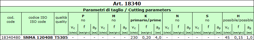 Insert DORMER PRAMET SNMA T5305 negative with hole for turning. Zero rake negative geometry with rounded cutting edge, suitable for finishing operations up to semi-roughing continuous to slightly interrupted cutting of cast irons and potentially hard materials, which produce short chips. CVD grade T5305 with very high resistance to chemical wear and abrasion, suitable for finishing applications with high cutting speeds also for productive processing of treated and hardened materials. Main application ISO class K01-K15, secondary H05-H15.