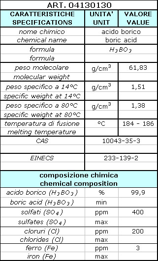 Acido borico granulare cristallino bianco, raffinato al 99,9%. Applicazioni: nell'industria ceramica per la preparazione di vetrine e smalti; nell'industria del vetro quale mezzo di introduzione dell'anidride borica; nell'industria metallurgica come disossidante nelle saldature e brasature; nell'industria conciaria quale antisettico; nell'industria del legno e della carta; quale materia prima nella preparazione di altri prodotti chimici e di leghe conteneti boro.