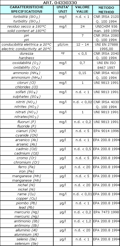 Acqua depurata demineralizzata (acqua distillata), inodore (UNICHIM 927 man. 169 p. I 1994), incolore ((UNICHIM 925 man. 169 p. I 1994)