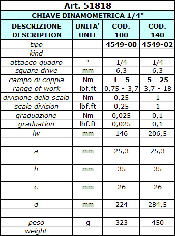 Chiave dinamometrica TORCOFIX - K con attacco quadro 1/4", con doppia scala in Nm e in lbf.ft. Classificazione secondo DIN EN ISO 6789:2003 tipo II classe A certificata, precisione di azionamento ± 3%.