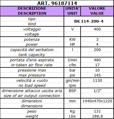 96187114 NR COMPRESSORI BK114-200-4 lt200 400V carrellati **