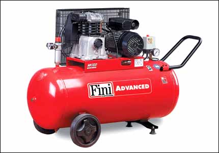 Compressore FINI MK 102-90-2 Advanced bicilindrico, monostadio, con lubrificazione, traino a cinghia, ventilazione forzata, serbatotio da 90 litri e motore trifase. Dotato di pressostato elettromeccanico, riduttore con manometro e rubinetto rapido, protezione elettrica del motore; carrellato con ruote gommate e doppio piede.