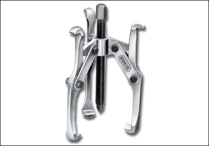 Estrattore a tre bracci a gancio rivoltabili in acciaio forgiato, adatto per l'estrazione di cuscinetti a sfere, ingranaggi, ecc. Bloccaggio automatico.