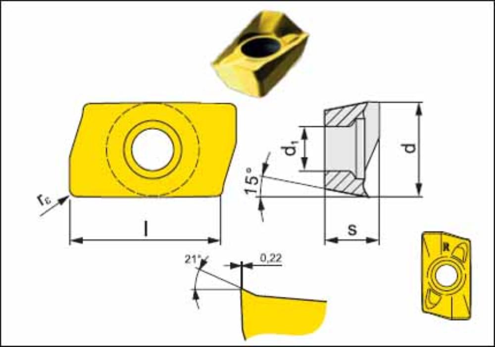 Inserto ADMX -R per fresatura. Geometria positiva con doppio rinforzo adatta anche a condizioni di lavoro poco stabili per i gruppi di materiali P e K, applicazione secondaria M, S, H. Rivestimento PVD 8215, applicazione principale classe ISO K15 e H10, secondaria P10, M10, S15.