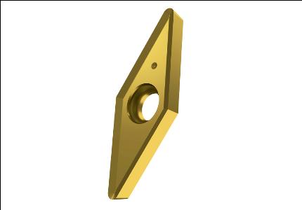 Inserto VCGT -NF2 con foro. Geometria positiva da finitura a semisgrossatura per taglio continuo e leggermente interrotto su gruppi di materiali P, M e K. Rivestimento CVD T9325, applicazione principale classe ISO P25, M20, secondaria K25.