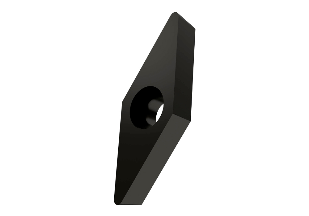 Inserto VCMW con foro. Geometria negativa a spoglia zero per finitura e semisgrossatura di materiali del gruppo K e H, per taglio continuo e leggermente interrotto. Rivestimento CVD T5305, applicazione principale classe ISO K10, secondaria H15, con elevata resistenza all'abrasione, per la lavorazione di materiali del gruppoP, K e H con elevate velocità di taglio.