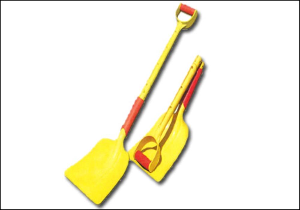 Pala per neve in fibra di vetro ad alta resistenza con manico ripiegabile. Dimensioni: pala mm 190 - 230 x 280, lunghezza totale mm 970, peso kg 1. Colore giallo e rosso.