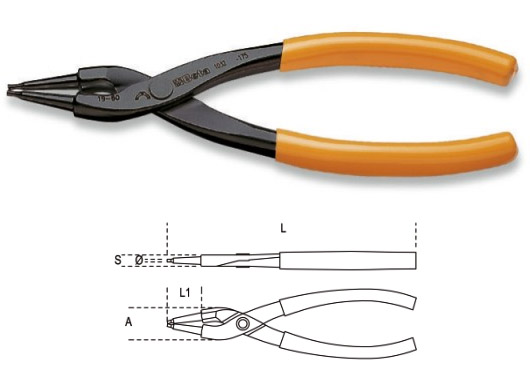 Pinza per anelli interni di sicurezza, forma dritta, UNI 7914, DIN 5256. Laccato nera, impugnatura antiscivolo.