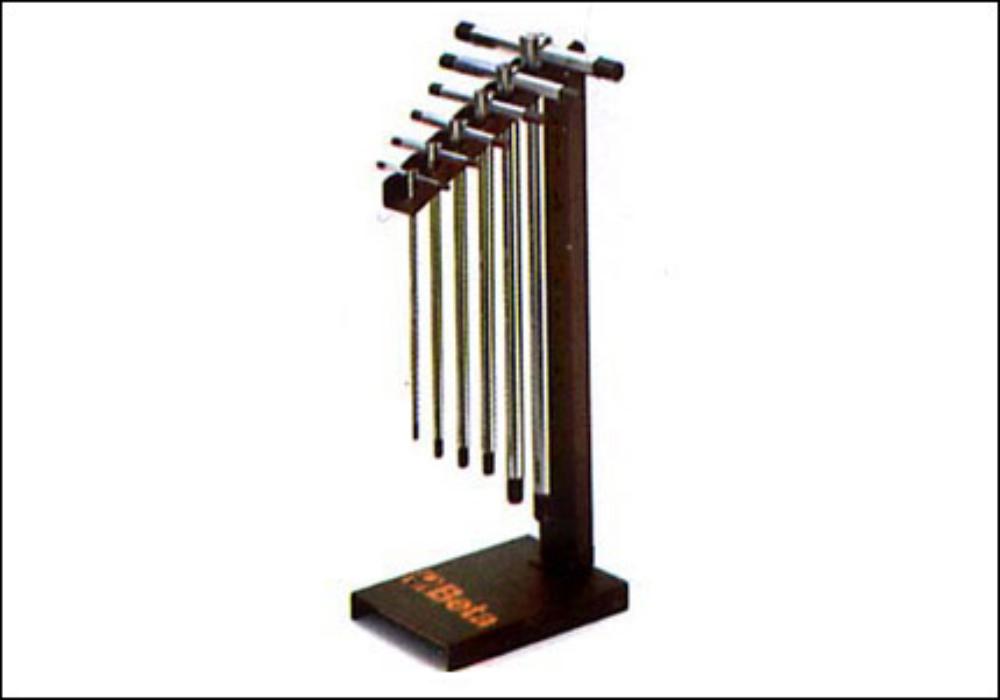 Serie di 6 chiavi a T per viti con esagoni interni con supporto di lamiera. Asta di manovra scorrevole, arrestabile nella posizione desiderata. Peso g 1035.