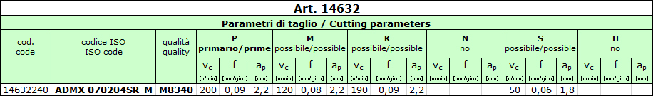 Inserto PRAMET ADMX07SR-M M8340 per fresatura: inserto di prima scelta con ampia gamma di opzioni universali. Geometria con design positivo per lavorazioni da leggere a medie, tagliente arrotondato con smusso che aumenta il grado di resistenza del cuneo contro i danni meccanici. Qualità PVD M8340 con elevata resistenza e tenacità del tagliente, è una delle qualità più tenaci dedicate a lavorazioni con velocità di taglio basse e condizioni difficili su acciai del gruppo P; l'inserto può essere usato anche su materiali dei gruppi M, K e S.