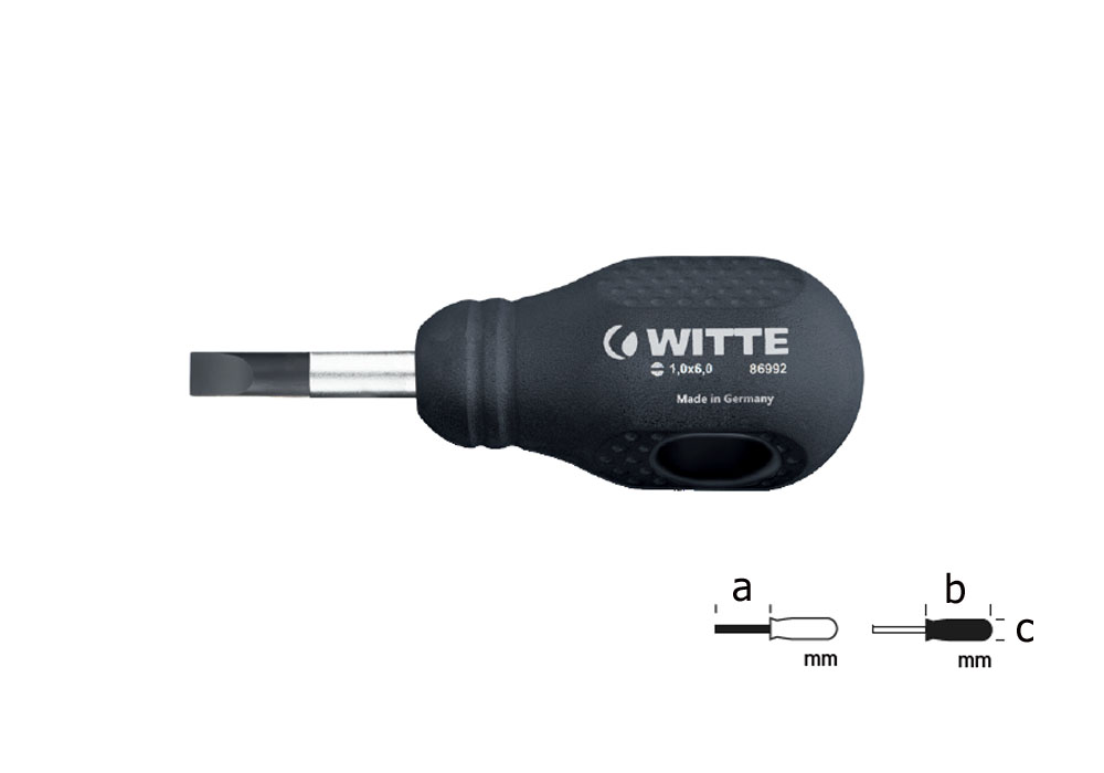 Cacciavite corto con punta a taglio, linea professionale MAXX. Lama in acciaio speciale cromato opaco con punta brunita, impugnatura ergonomica in materiale morbido antiscivolo con foro e marcatura della misura.