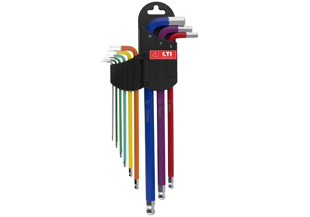Serie di 9 chiavi ad L per viti con esagono incassato con custodia in PVC, corpo colorato per facilitare l'identificazione della misura, punta magnetica per trattenere la vite anche in caso di lavori difficoltosi.