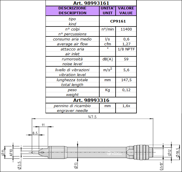 Penna pneumatica per incisione Chicago Pneumatic CP9161 leggera e compatta con potenza regolabile, consente di incidere la maggior parte dei materiali e superfici, compresi pietra, metallo e vetro. Dotata di un ago con punta in carburo di mm 1,6 di facile manutenzione e sostituzione. Fornita con tubo flessibile in PVC.