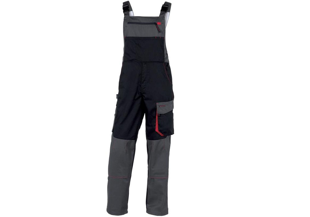Salopette da lavoro D-MACH in sargia 65% poliestere e 35% cotone 245 g/m², colore nero-rosso. Bretelle elasticizzate regolabili, chiusura vita con bottone, rinforzo sul fondoschiena, 8 tasche di cui 1 portametro, predisposizione per ginocchiera, parte bassa dei pantaloni antisporcizia. A norma EN340:2003 requisiti generali per i capi di abbigliamento; DIRETTIVA DPI 89/686/CEE. Articolo ad esaurimento.