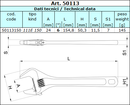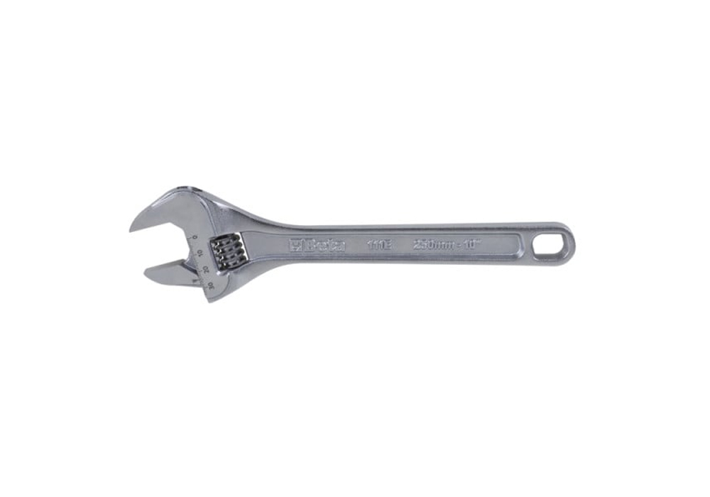 Adjustable open-end wrench BETA 111E for tightening and loosening nuts and bolts of various sizes, DIN 3117, ISO 6787. Graduated scale with double marking in mm/inches, satin chrome-plated body, hole on the handle for hanging the wrench.