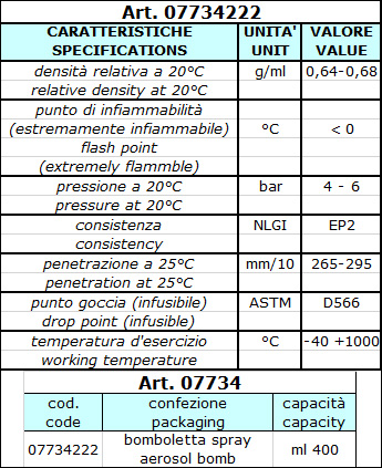 Lubricant GRASSO AL RAME (COPPER GREASE) made of super-fine foliated copper particles and corrosion inhibitors.Resistance to high temperature (1000°C with peaks of 1100°C), high adhesive capacity and anti-corrosion power. Suitable for pins in motor exhausts, threaded connections, injection valves, etc. Light brown/orange/copper color, characteristic solvent odor, in 400 ml spray bomb.